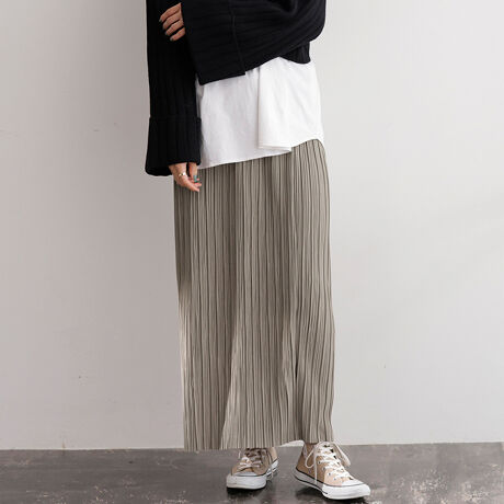 ランダムプリーツが縦のラインを強調し、すっきり見せを叶えるプリーツスカート。