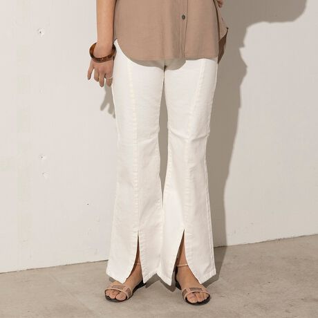 センターに切り替え、フロントスリットを配しトレンドのエッセンスをプラス。ヒップから膝まではすっきりとタイトに、膝から裾に向けてのフレアラインはとてもきれいなシルエットになっています。フロントスリットから足の甲をのぞかせてスタイリングにヌケ感を作ったり、華奢なサンダルやミュールなどを合わせて女性らしいスタイリングが可能です。ウエストのゴム仕様やストレッチの効いた素材を使用し、穿き心地もラクチンなのがデイリー使いに嬉しいポイント。オールシーズンで着用可能なおしゃれスリットデニムは必見です。