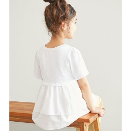 ・後ろ裾を、布帛のティアードデザインで切り替えた半袖クルーネックTシャツ。
