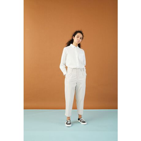 サラッとした肌触りにキレイな表面感、マットで柔らかな光沢が特徴のキレイ目素材は原料の一部に竹が使われています。生地の特徴として吸湿速乾性にすぐれ、防臭機能や抗菌機能が有ります。そんな素材を使ったイージースラックス。ヒップから太ももにかけてゆるやかなユトリが有りながらもフロントのタックによりスッキリとした表情をつくっています。裾にかけてほのかにテーパードを効かせたシルエットにより程よいヌケ感も出ています。ウエスト部分にゴムとヒモも入っているのでベルトをしなくても履けるらくちんな所も◎。ヒップポケットのフラップが三角になっている点もさり気ないポイントになっています。サイズは0,1,2,3と4サイズ展開があり、サイズの変化であえてルーズに楽しむ事が出来るジェンダーレスなアイテムです。ポケットに使われている素材は抗ウイルス加工を施した素材を使っています。また、釦には再生可能な有機性資源のバイオマス釦を使い、ヒモにはペットボトルをリサイクルしたモノを使用して少しでもサステナブルにも配慮した取り組みをしています。