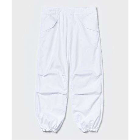 M-65のミリタリーパンツをベースにカーゴポケットを無くし、リラックスフィットはそのままに、ウエストをイージーパンツ仕様に変更。ポケットのフラッ プ、膝のタック、裾口のスピンドル、のみ採用。裾はロールアップして紐を縛ればクロップ丈に調整可能。ルームウェアとしても快適に過ごせます。