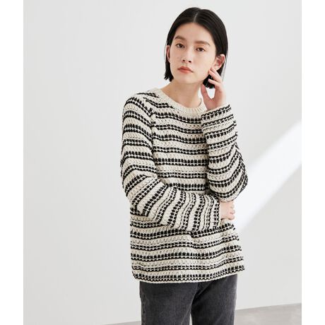 3種類の清涼感のある太番手の異なる糸をミックスしながらゆっくりと編み、立体感のある柄を表現した1枚。ボーダーのピッチが細めなのでカジュアルすぎずきれい見えするのもポイントです。