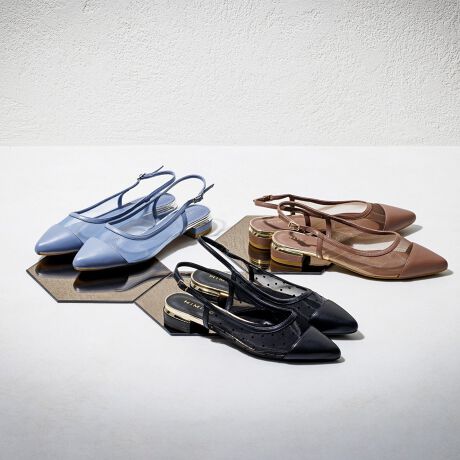 シーズンレスで活躍するバックベルトパンプス。涼し気なチュール素材とサイドメッシュで、程よい透け感が生まれます。ローヒールながら、ヒールのメタルパーツとポインテッドトゥで女性らしさを格上げしてくれる一足。