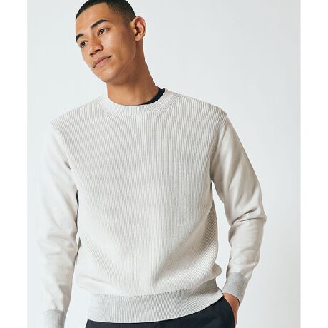 ■デザイン身頃が7Gの片畦、袖が12Gの天竺に切り替わっている異ゲージクルーネックセーターです。また、袖リブ・裾リブに配色の糸を引き揃えにしメランジ調にしています。■素材ガス焼き加工を施した綿100%の糸を使用しています。ガス焼き加工とは糸の表面に出ている毛羽をガスの炎で焼いて、平滑で光沢を持たせる手法です。今期から原料をインド綿に変更していますので若干風合いが良くなっています。