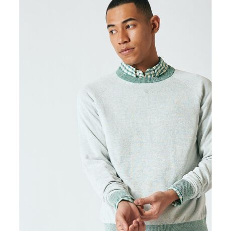 ■デザインラグランスリーブ、衿下にガゼットが付いています。また、天竺の袋編みという手法を使い表の色と裏の色を使い分けています。2色とも表の色を白にし、裏の色が透けて見える仕様にしています。■素材綿ナイロン。糸に微弱な形状を持たせた事により、肌離れの良いさらっとした風合いが感じられます。