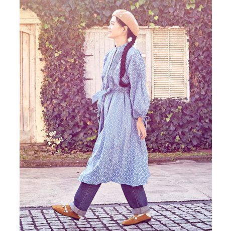 チェコのボヘミアガラスのボタンがアクセント。オランダをイメージしたクラシックな小花柄が可愛い。胸元のピンタックデザインやウエストのリボンがどこかレトロな雰囲気です。袖口にも調節可能なストリングをあしらい、細部にもこだわりが。さらりと1枚で着るだけでお洒落に仕上がる主役級ワンピースです。
