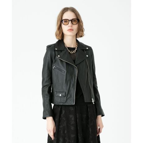 すっきりとしたコンパクトシルエットで、ボリュームのあるワイドパンツやワンピースとも好バランスな着こなしが楽しめるライダースジャケット。