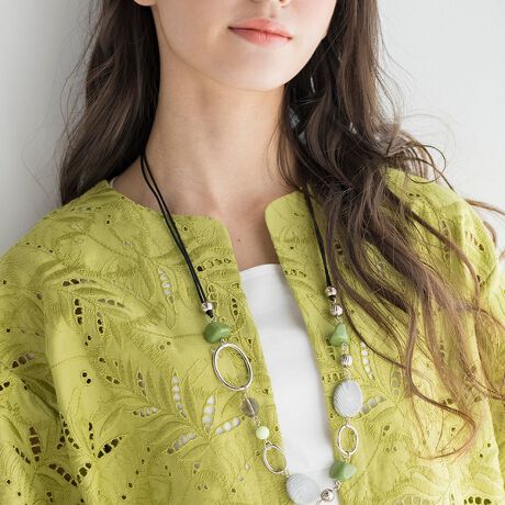 グリーンとオレンジの二色展開。すべてがカラーパーツになっているのではなく、マーブル模様やリングのパーツを入れてあるのでコーディネートに合わせやすく、元気な色味が程よく馴染みます。