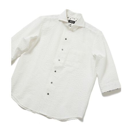 ストライプの太さが異なる3種類のシアサッカー組織を組み合わせた生地を使用しています。凹凸感のある生地なので肌への接地面が少なく、着心地抜群。涼しげなシアサッカーを斜めに大胆に切り替えたデザイン性の高い一枚です。