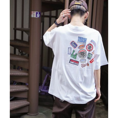 バックスタイルにステッカーのプリントを施したストリートなデザイン。