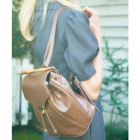 バンブーハンドルやレトロな金具使いのデザインがアンジェラスのお洋服に合わせやすく、楽ちんなリュックでありながらクラシカルな雰囲気に…♪