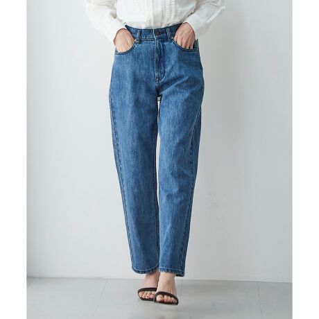 ハイウエストのデニムパンツは、カーブがかったテーパードシルエットが今年らしい1枚。