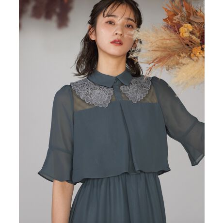シンプルなシルエットに、レースの衿を重ねたデザインがアクセントに。