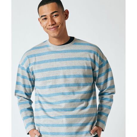 Jプレスのテクニカルボーダー ロンT。■デザインドロップショルダーで、全体的にボリュームを持たせたシルエットになっています。一目飛ばしになっているNEWデザインのボーダーが新鮮です。また、インレーという糸を多く使う編地は重くありがちですが、そこの問題をクリアし軽く仕上がっているのが特徴的なカットソーです。■素材綿100%のインレー素材。[型番:KKOVIZ0104]