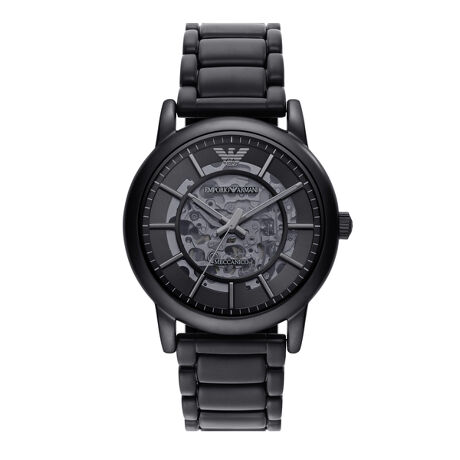 43mm径ケースに自動巻きスケルトンムーブメントを搭載したEmporio Armani ウォッチ。ブラックのバーインデックスを配したマットブラックのダイヤルに、ブラックのステンレススチール製バンドを組み合わせました。
