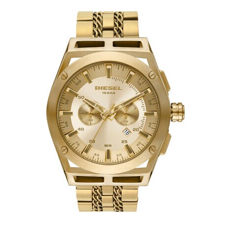 48mm径ケースにクロノグラフムーブメントを搭載したDIESEL TIMEFRAMEウォッチ。バーインデックスを配したゴールドのサンレイダイヤルに、ゴールドトーンのステンレススチール製バンドを組み合わせました。