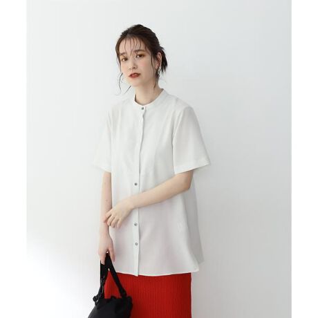 程よいハリとドライタッチな肌さわりが心地いいブラウス。バンドカラーとビブヨークデザインがアクセントとなり、オフィスにも着用できる大人な雰囲気の1枚。体のラインを拾いすぎないシンプルなシルエットは、両サイドのスリットデザインで抜け感をだしており、アウトスタイルも軽やかな印象で着用できます。ご自宅でお洗濯ができ、デイリーに気兼ねなくご利用いただけます。※お洗濯の際は、付属の注意書きや商品についている品質表示をご確認いただきますようお願いいたします。