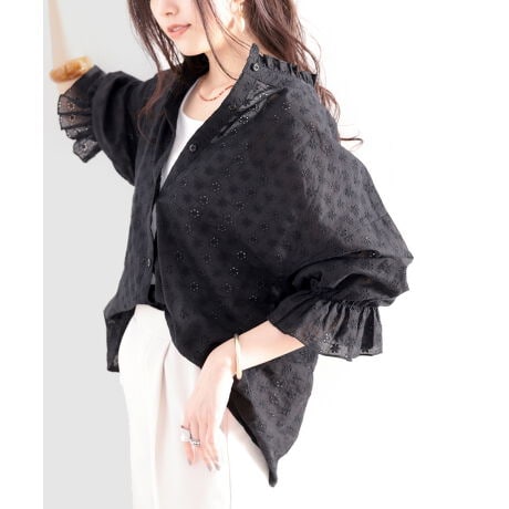 ほどよい透け感と花柄刺繍が女らしくカジュアルな抜け感に。