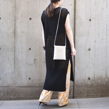 ざっくりとしたメッシュ編みが涼し気で、こなれた印象のロングニット。