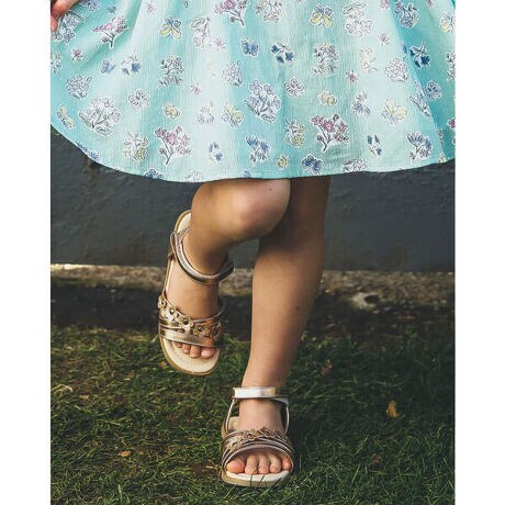 ベベのグリッター フラワー モチーフ メタリック サンダル (15〜21cm)。