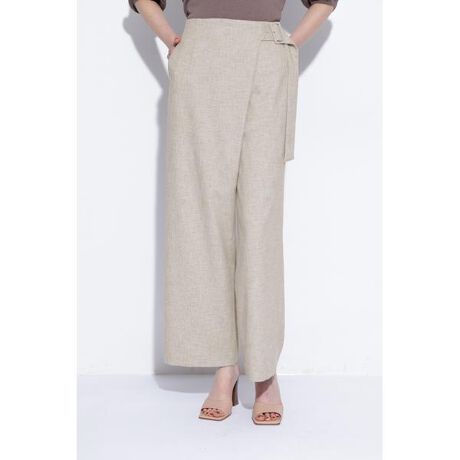 ラップ風デザインのワイドパンツミックス感のある糸を使用した、ナチュラルな雰囲気の麻調合繊素材を使用。ナチュラル見えなのに合繊という進化系素材です。
