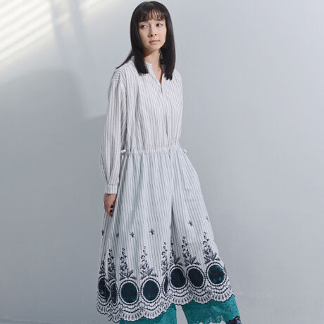 ワンピースは首元が綺麗に見える様に、スキッパー衿のデザインに。ゆったりとしたシルエットですが、ウエスト紐を通しているので分量感を調節しながら着こなしかたを楽しめます。