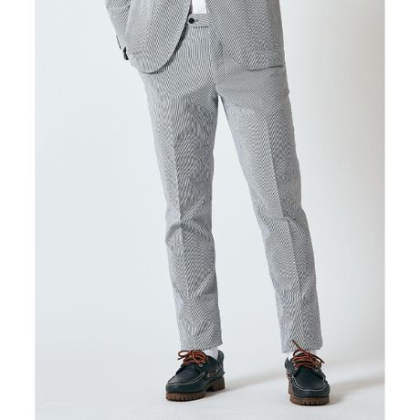 ■デザインウエストドローコード仕様のイージートラウザーです。帯の持ち出しや脇のバーティカルポケットなど、デザインはあくまでもクラシックですが、後見頃のゴム仕様やドローコードなど、軽快な仕様も組み込んでいます。家庭洗濯可能です。■素材こちらもJ.PRESS PLUSの立ち上げ当初から展開してきたコットンポリエステルサッカーをリニューアル。緯糸にリネンを加え、より軽やかな風合いを目指しました。今までのサッカーは独特の光沢感がありましたが、マットで落ち着いた控えめな見え感もJ.PRESSらしくアップデートしています。緯糸にエコ原料を使用することでサステナブルな要素も加えています。