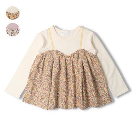 毎年人気のTシャツとキャミを重ね着しているようなレイヤードデザインの長袖Tシャツ。春らしい小花柄のフレアーなシルエットもポイント!【アイテム】トップス シンプル ガーリー フェミニン カジュアル お洒落 オシャレ かわいい 可愛い 普段着 デイリーウェア お出かけ着 お外着 お外遊び着 ロングスリーブ 長袖 子ども こども 女児 女の子 ガールズ キッズ ベビーサイズ トドラーサイズ 幼稚園 保育園 小学校 通園 通学 小学生 2022年春物新作 丸高衣料 ロンT チュニックTシャツ フラワー 白色 桃色 コットン100% 綿100%