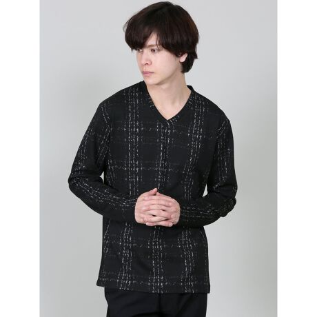 ふくれジャガード かすれチェック Vネック長袖Tシャツ