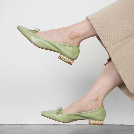 パールがあしらわれたヒールがフェミニンなパンプス。アッパーの華奢なリボンが女性らしい印象に◎太めのローヒールなので、長時間履いても疲れにくいのが嬉しいポイント。柔らかい素材なので、足あたりもソフトです。[型番:TM22134]