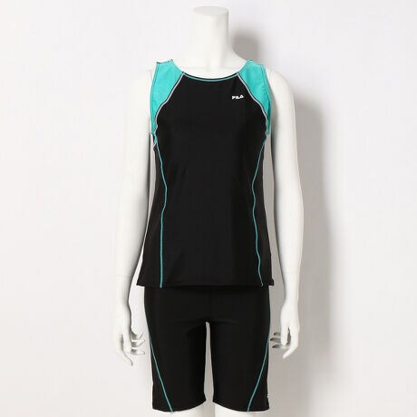 無地 エンボス かぶりタンキニ水着(めくれ防止)2way方向によく伸びる生地を使用。シンプルなセパレーツ水着。脇切り替えエンボス生地の光沢差がスポーティーです。カップの取替え可能な挿入カップ式。15mmのゴムがアンダー内側に入っていて胸を固定して綺麗にみせます体に沿った切り替えとステッチの視覚効果でシャープな脇ライン。ボトム前部分は伸びの良い裏地付。ウエストはスピンドル入りで調節可能。めくれ防止機能付。FILAロゴプリント入り。