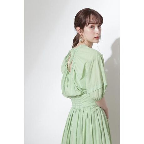 同素材のスカートとセットアップ対応のメリッサブラウス軽くて肌離れするコットン素材を使用し、夏にむけて着用いただけます。前はすっきりと、後ろは背中あきのリボン付バックオープンデザインが可愛らしいポイントに。デニムカジュアルにも柄スカートにも着まわしできるデザインはシーズンライクなカラーも魅力。メリッサスカート(店舗品番0922120020)を揃えていただくと、ワンピース風の装いに。