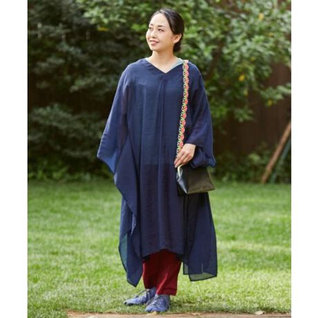着物のような衿合わせで首元はすっきり。中に重ね着をしても涼やかに着られます。