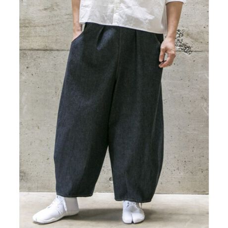 デニムの名産地・岡山県の井原デニムを使用した、上質で心地良いワイドシルエットのメンズもんぺパンツ。しっかりと厚みのある生地感。国産の確かな品質を味わいながら、デニムの風合いを堪能できます。
