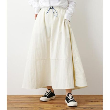ナイロン素材を使用し、軽さと程よいハリ感が特徴のAラインスカート。ウエストには配色のゴムコードを使用しストッパーで調整可能です。※商品画像はサンプルのため、色味やサイズ、素材の混率等の仕様に変更がある場合がございますので、予めご了承ください。※一部予約商品につきましては生産上の都合によりお届け予定日や店頭発売と前後する場合もございます。※追加生産商品は、一部の店舗、通販で販売中の場合がございます。予めご了承下さい。