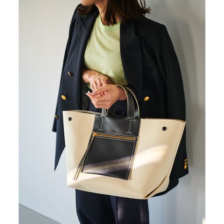 バイカラーで、シックにもモードにもふれるカラーリング。ステッチもバイカラーにして、こなれた存在感を発揮。ブラック&ホワイトの本体に、深くこっくりしたゴールド金具の色を合わせて落ち着いた印象に。