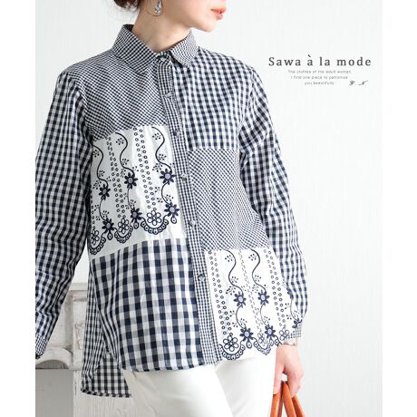 大人可愛い切替ギンガムチェックの流れる花刺繍ブラウス。色んな大きさのギンガムチェックが切り替えられたお洒落なデザインです。流れる花刺繍が大人のナチュラルな可愛さを演出してくれます。綿混合のさらりとした肌触りの良い生地です。子供っぽくならず大人の上品な雰囲気にしてくれる1枚です。
