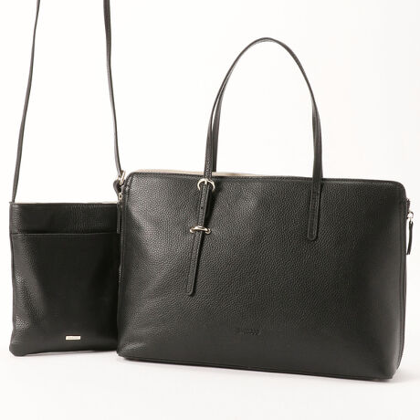 丈夫でキズが付きづらく、肌ざわりの良い人気のシュリンクレザーを使用した、トートバッグとショルダーバッグのセットです。A4サイズ対応で、タップリと収納する事が可能です。トートバッグは、サイドのファスナーを開けば配色がアクセントになってカジュアルな雰囲気でも使用いただけます。トートバッグと同じ牛革を使用したポシェットもセットでご用意しました。
