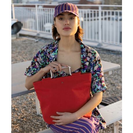 金具ハンドルがポイントのコットンキャンバス素材のハンドバッグ。シンプルでどんなコーディネートにも合わせやすいアイテムは、オンにもオフにも活躍します。フロントには小さなb.ロゴパーツが付いています。