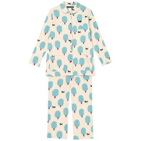 【パジャマ(ロング袖ロングパンツ)】クリエーター“俣野温子”がデザインする、甘くなりすぎない大人かわいいテキスタイルとカラーで、くつろぎ時間を楽しく過ごせるウェア綿100%のスムース素材です。森の中で小さな猫が遊んでいる様子を描いた、楽しいテキスタイルです。胸ポケットから顔をのぞかせている黒猫のアップリケがデザインのポイントです。楽しくて便利な一着です。※アイテムによって柄の出方が異なりますのでご了承ください。【サイズ詳細】M:バスト108.0cm 着丈70.0cm ズボン脇丈95.0cm ウエスト55.0cmL:バスト116.0cm 着丈70.0cm ズボン脇丈95.5cm ウエスト59.0cmLL:バスト124.0cm 着丈71.0cm ズボン脇丈96.0cm ウエスト64.0cm※出来上がり寸法を表示しております。※サイズ詳細の寸法には多少の差異がございます。