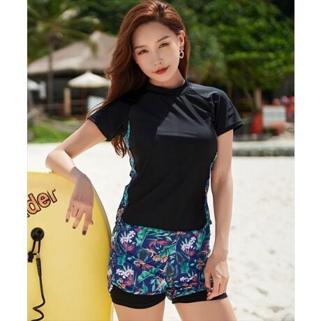 フィットネス水着 半袖Tシャツ+レイヤードショートパンツ+水泳帽