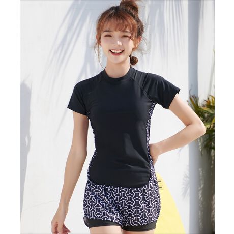 フィットネス水着 半袖Tシャツ+レイヤードショートパンツ+水泳帽