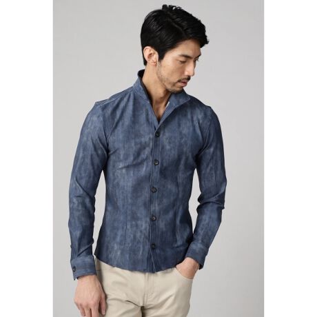 ハイテンション素材を使用したデニムプリントシャツ。抜群のストレッチ性が快適な着心地を生んでいます。衿には形状保持芯を入れ、開けた時に自由にアクセント付けできる仕様に。18ミリのボタンを使用し、インナーシャツとしてもブルゾンライクな軽い羽織シャツとしてもお使いいただけるように仕上げています。