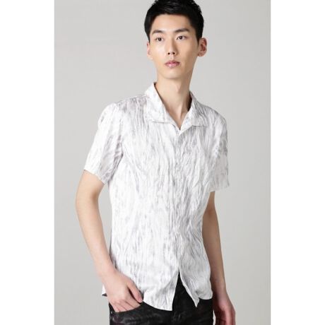 クラウドゼブラプリントの半袖シャツ。縦ストライプ状にゼブラを配することでワイルドなアニマル柄をシャープな印象に。製品でクラッシュプリーツ加工を施し、ランダムな凹凸の表情とタイトシルエットに仕上げています。
