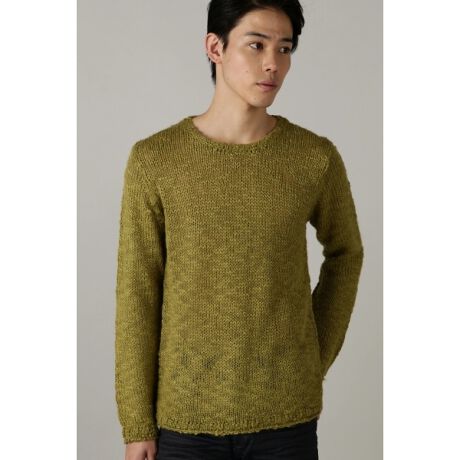 スラブ感のある太い糸で編まれたローゲージクルーネックニット。衿や袖口、裾を編みっぱなしにすることでカットオフのようなロックな雰囲気にしています。カラーはライトグレーとイエローグリーンなので、重くならずにアウターのインナーなどで、コーディネートのポイントになるアイテムです。