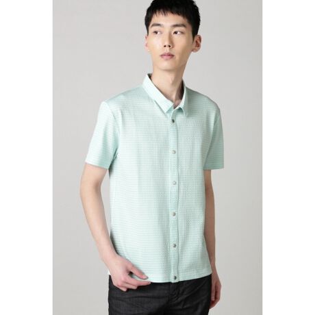 バスケットジャガードの前開きカットシャツ。柔らかく、伸縮性のあるカットジャガードで作られていて着心地が良いです。コンパクトな衿のシャツデザインなのでシャープで都会的な雰囲気を持っています。