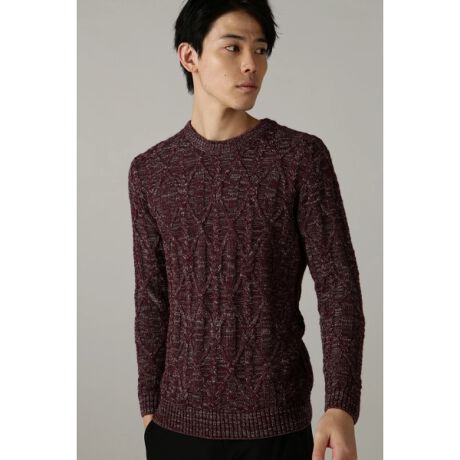 全面ケーブル柄のクルーネックニットです。独特のメランジ見えのケーブル柄は、ブルゾンやコートのインナーとして冬のコーディネートに欠かせないウオーム感あふれるベーシックアイテムです。