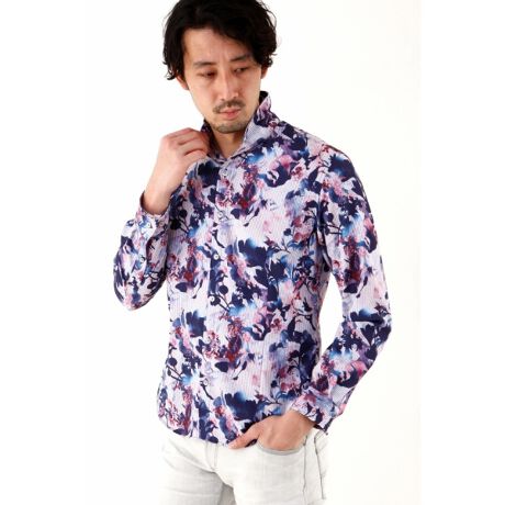 花柄の残像をイメージさせるボタニカル柄別注プリント素材を使用したショートウイングカラーシャツです。