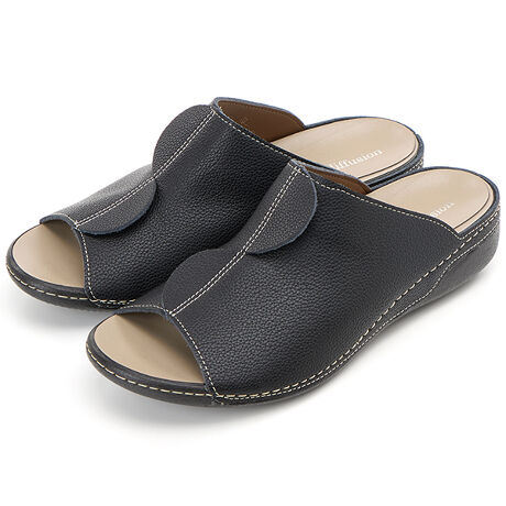 幅はゆったり、甲をしっかりと覆ってくれるらくちんミュール。甲の大きなスカラップ、シンプルながらレザーにステッチを効かせたデザインがポイント。