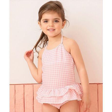 キッズ チェック柄オールインワン女の子水着 ホルターネックタイプ